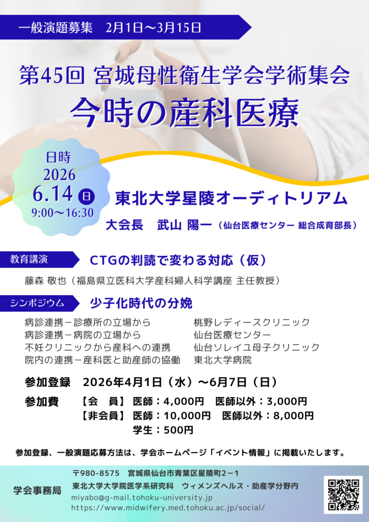 第45回 宮城県母性衛生学会学術集会を2026年6月14日(日)に東北大学星陵会館星陵オーディトリアムにて開催いたします。